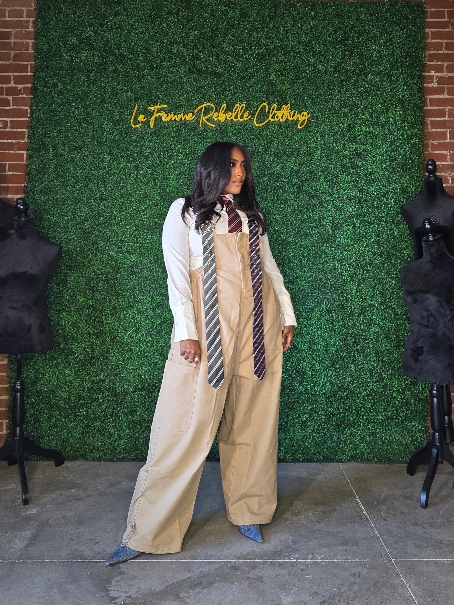 Shop these must-have khaki overalls featuring adjustable corporate neck tie straps, drawstring ankles and outside cargo pockets. Shown with LFR Essential Oxford Shirt.