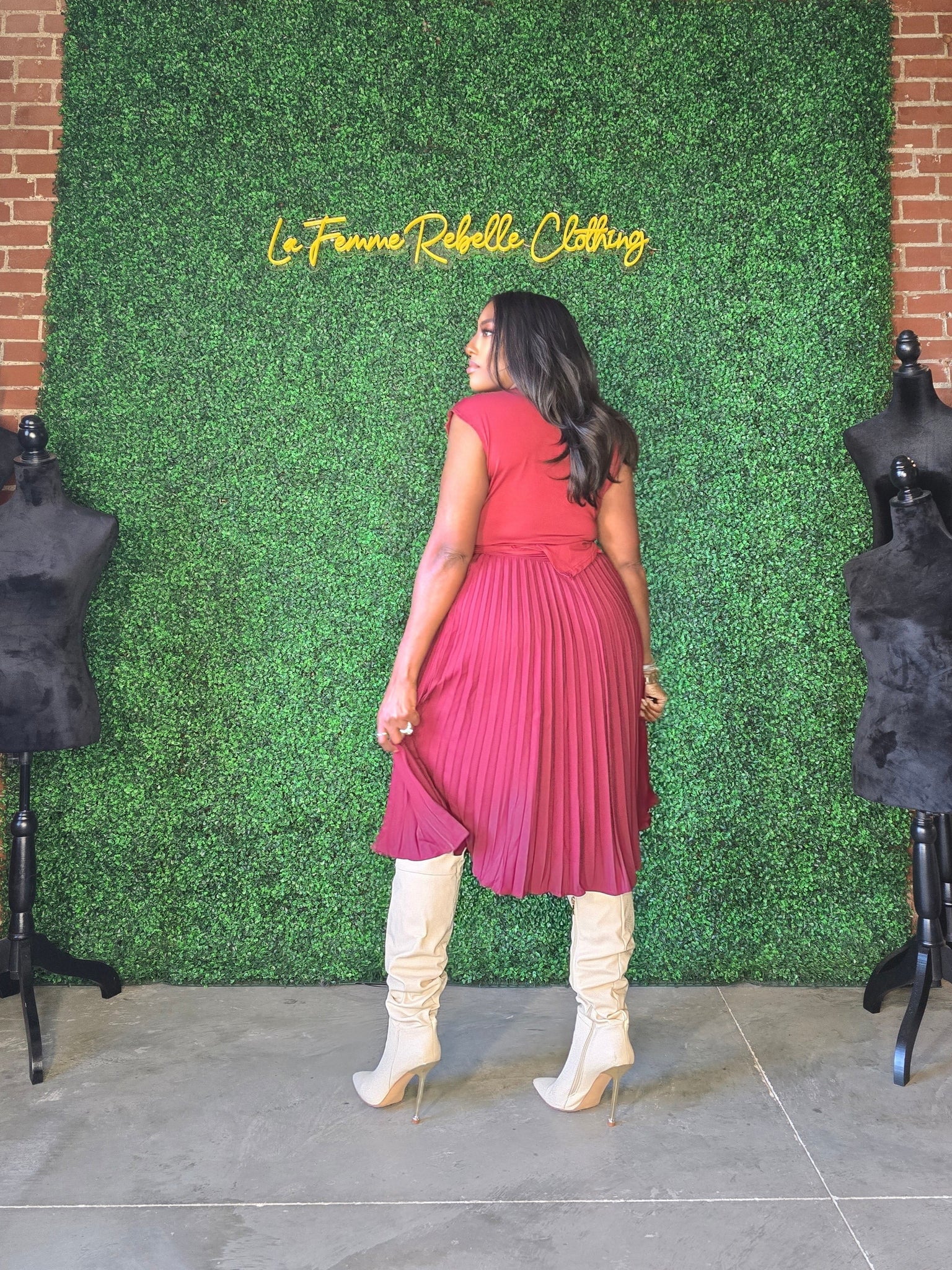 This is an elevated look! Shop this monochromatic, skirt and wrap blouse set. The midi skirt features an elastic waistband and pleated design; and the blouse is a bias cut featuring wrap bottom and cap sleeves. Shown with Parisian Denim Wang Boots.