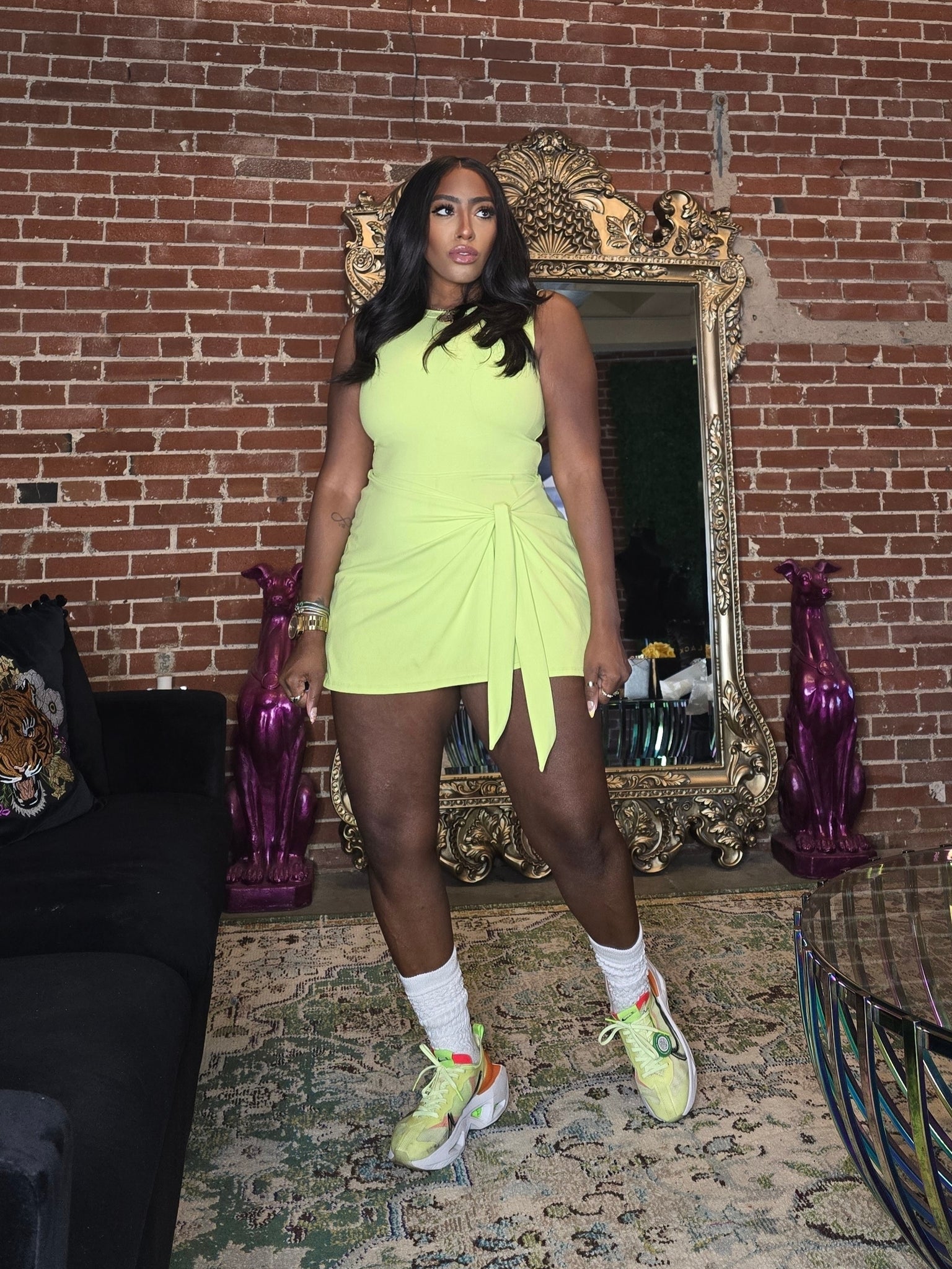 This fun, sporty dress is similar to the Osaka Piste Bodycon Skort. Shop the must have mini tennis skort onsie featuring faux wrap tie skirt, side pockets and shorts liner. Shown with Phoenix Essentials LFR Sandals.